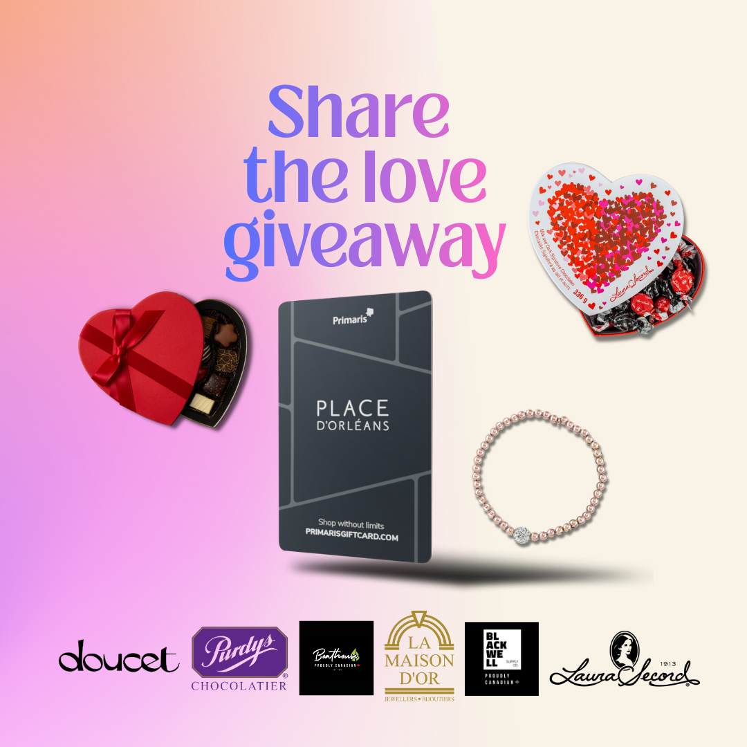 This Valentine’s Day, we’re sharing the love in a big way! Enter for your chance to win a stunning Valentine’s prize pack valued at over $1,100, featuring a Place d’Orléans gift card and sweet surprises from some of your favourite retailers.